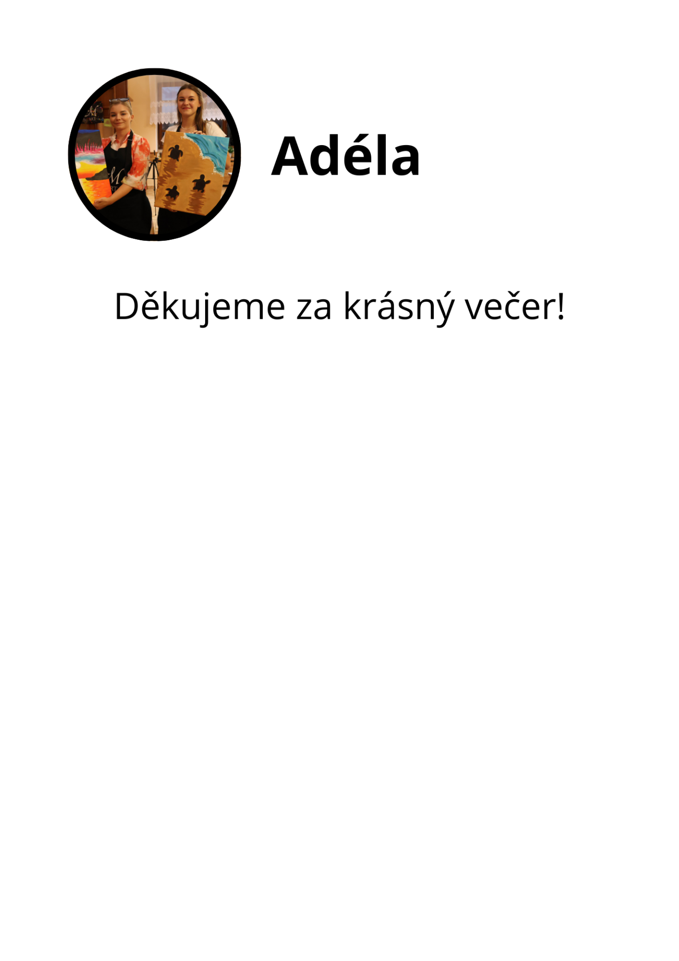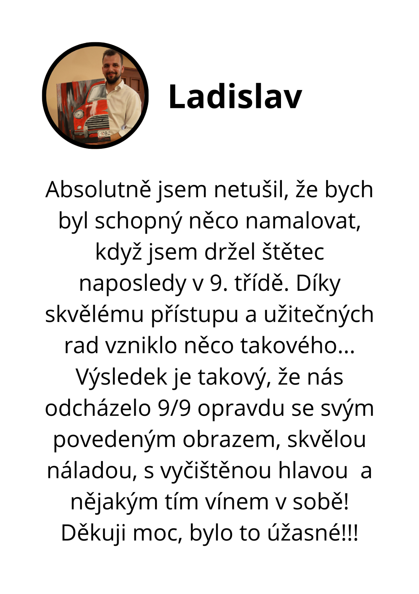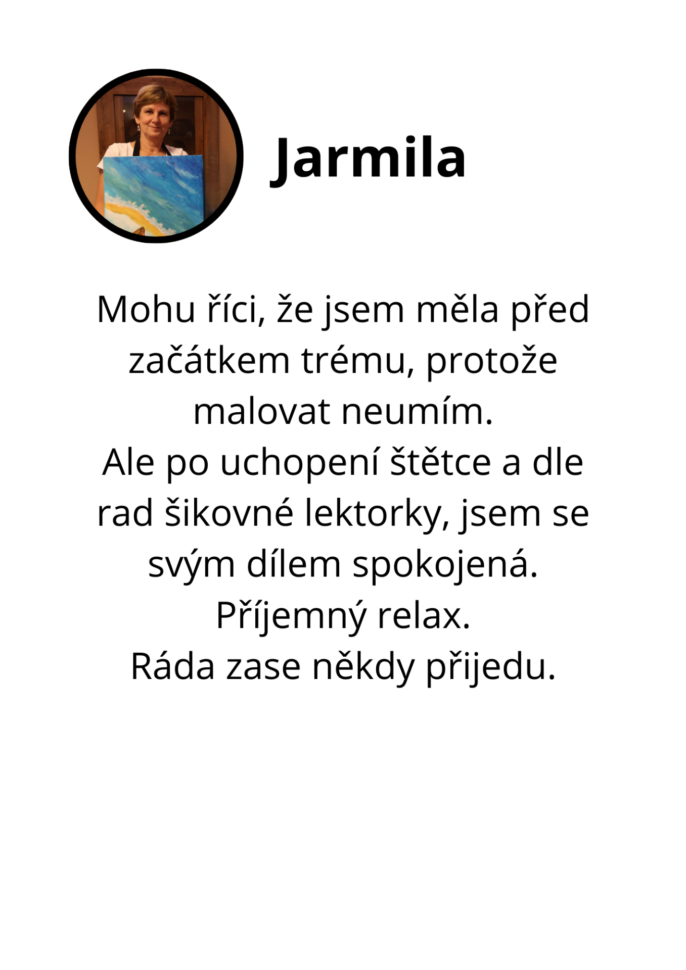 Každý účastník postupně pod mým vedením zvládne vytvořit vlastní obraz, i když nikdy předtím nemaloval.